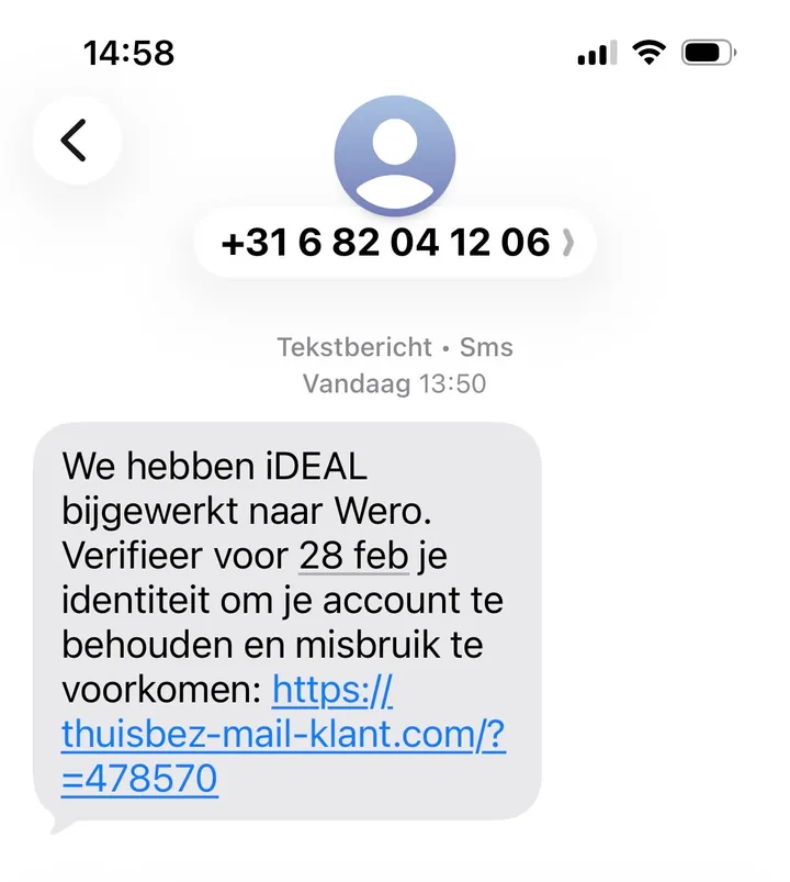 De overstap van iDEAL naar Wero is in volle gang en dat brengt voor criminelen vooral de mogelijkheid tot fraude met zich mee. Er gaan verschillende SMS’jes en e-mails rond die je onder druk zetten om je identiteit te verifiëren voor Wero. Dat is klinkklare onzin en een poging van criminelen om toegang te krijgen tot jouw rekening.