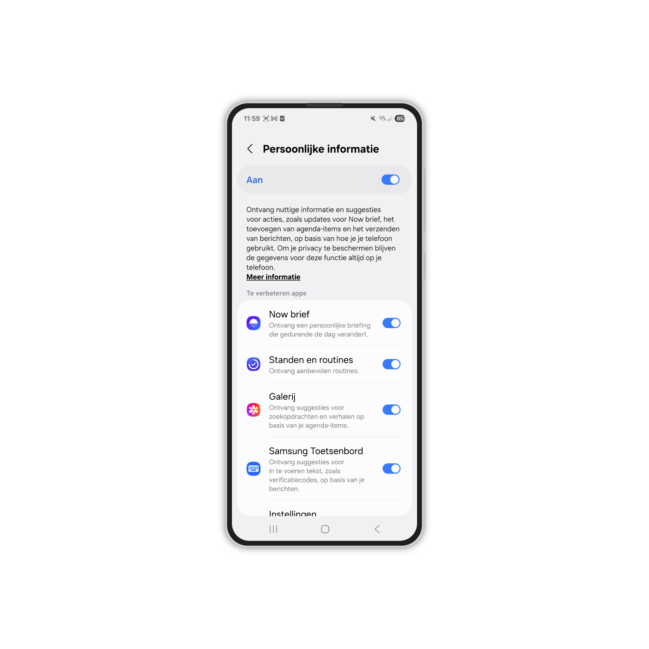 4. Open Persoonlijke gegevensintelligentie. 5. Schakel Now Brief uit door de schakelaar uit te zetten.
