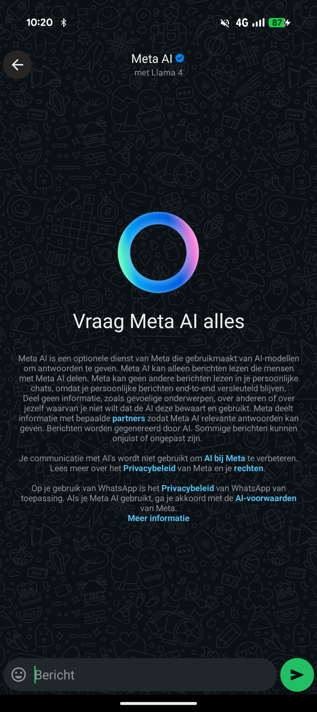 Goed om te weten qua privacy: Meta geeft aan dat het alleen berichten kan lezen die jij met de chatbot deelt (dus in dat specifieke WhatsApp-gesprek). Het kan geen berichten lezen in je persoonlijke chats (mede omdat die end-to-end versleuteld zijn). Meta geeft aan dat de informatie die je bespreekt met de AI-chatbot niet wordt gebruikt om AI te trainen.