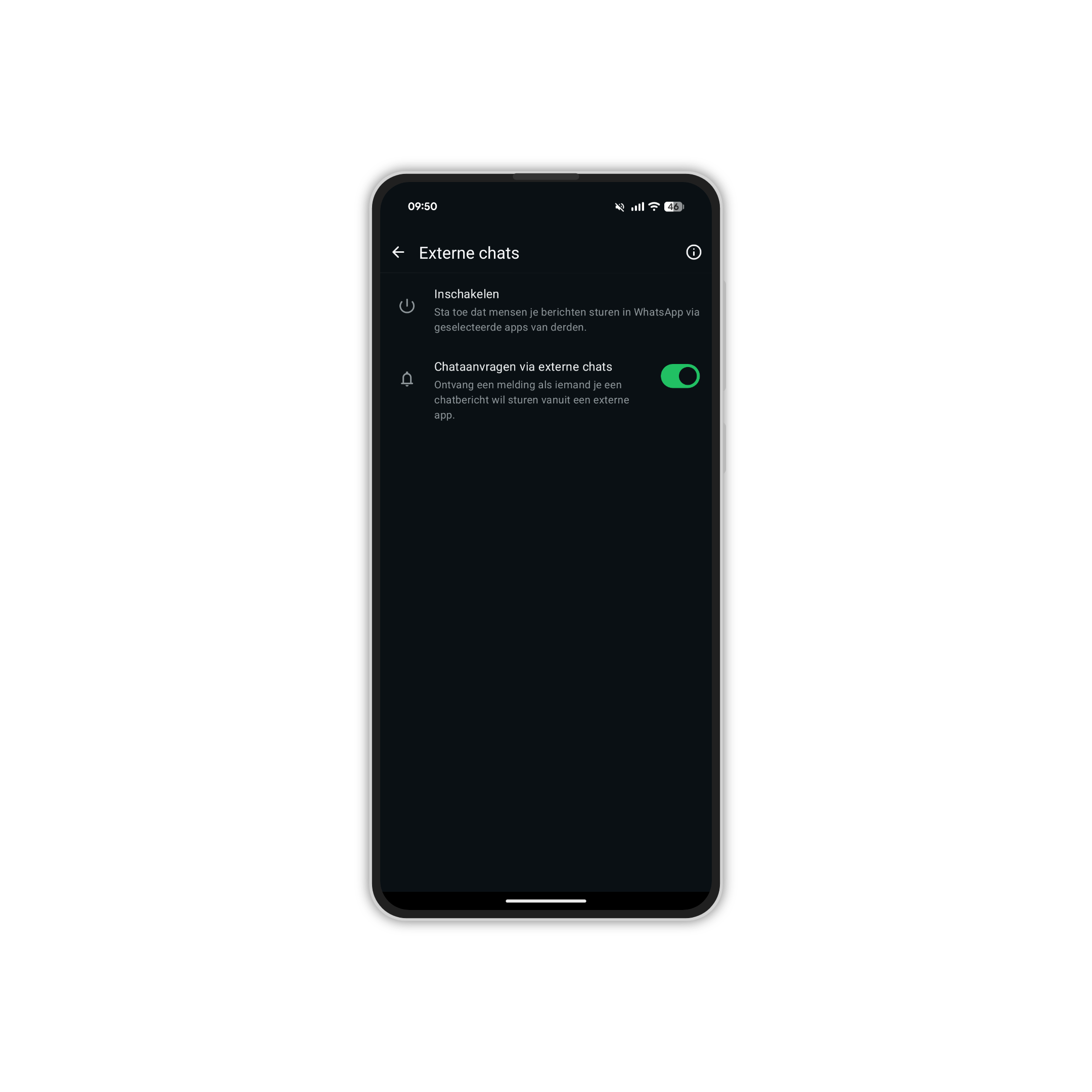 Nadat je deze stappen hebt doorlopen, zie je in het thuisscherm van WhatsApp een nieuwe optie staan, ‘Externe chats’. Hier kun je gesprekken beginnen met contacten buiten de dienst van Meta. Houd er wel rekening mee dat je vervolgens ook moet inloggen op de andere berichten-app en daar dus een account moet hebben en kunnen inloggen.